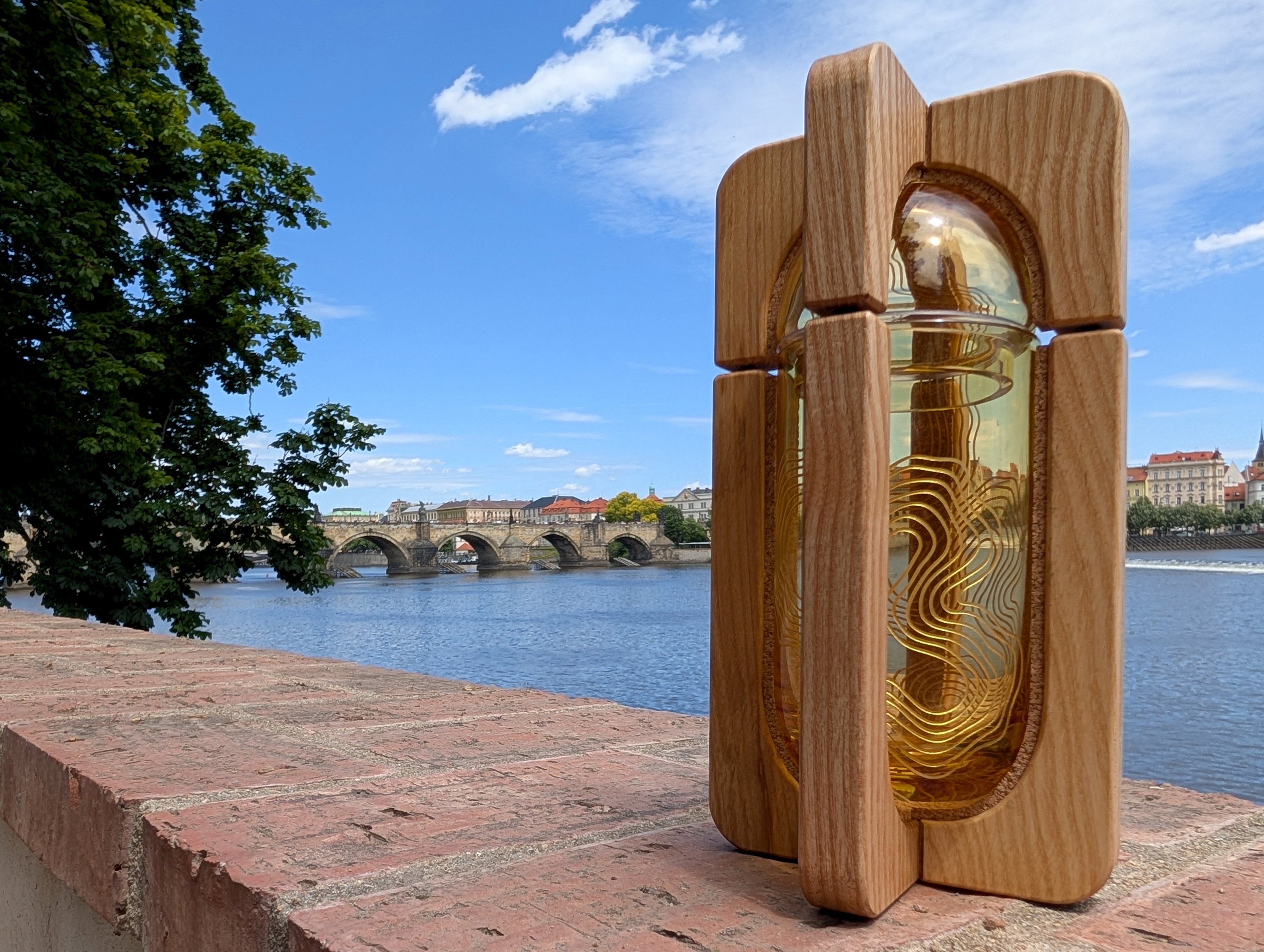 Skleněné srdce Vltavy i přepravní kapsli na vodu navrhli designéři a vyrobili skláři firmy Lasvit. Barva skla byla vybrána tak, aby co nejvěrněji odpovídala skutečné barvě vody v řece Vltavě na horním toku. Obě nádoby jsou zdobeny brusem, který představuje meandry řeky.