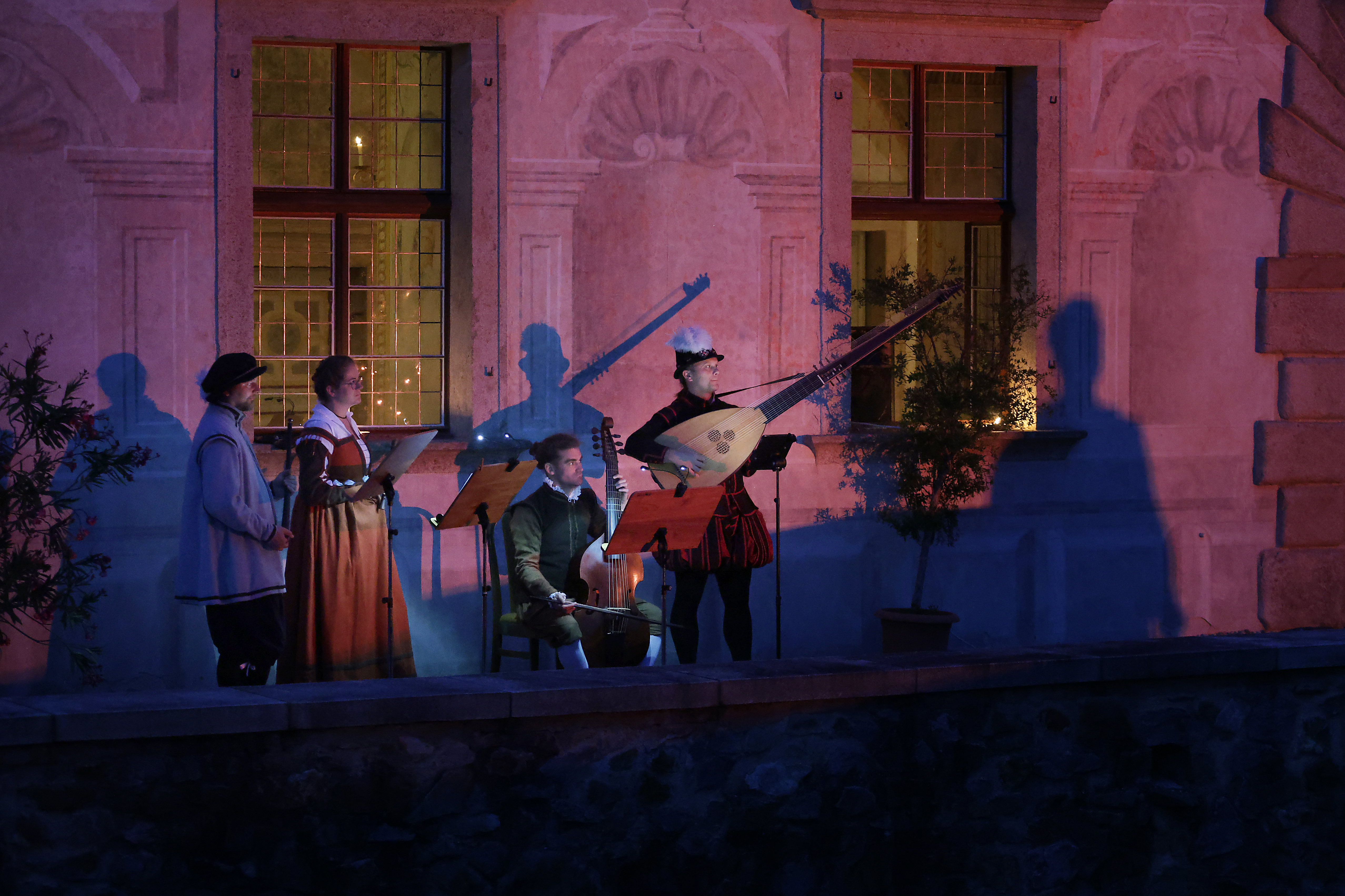 Během čtyř večerů se tak v zahradě a interiérech zámku rozezní hudba a poezie z přelomu 16. a 17. století a s pomocí herců, zpěváků a tanečníků odvypráví mj. legendu o původu pětilisté růže Rožmberků, tajuplnou baladu o proměně mladé dívky v bílou laň či příběhy o touze alchymistů rozluštit mystérium přírody. Průvodcem večera bude postava Zrcadla, která přiblíží dobové způsoby vnímání světa, odkryje kosmogonické souvislosti renesanční symboliky a zavede diváky za skrytými tajemstvími zámecké zahrady. Vystoupí i alegorická zosobnění planet, živlů a mytologických bytostí a společně vytvoří apoteózu svátečního prostoru i času zakončenou velkolepým historickým ohňostrojem.